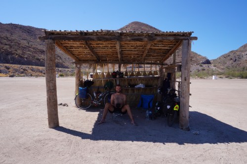 When we bid farewell to Mulegé we remembered Myron, the beach yeller/fireworks enthusiast from San Lucas. He had recommended that we check out Playa Santispac on our way south from Mulegé. Only 20 kilometers that day, and they were brutal. (Note from Alex: think unrelenting sun from 6:30AM on, sunscreen dripping into your eyes, almost pass out on a minor hill type brutal.) Lucky for us, Playa Santispac turned out to be just as wonderful as Myron made it out to be. Our hearts leapt with joy as we coasted down a long downhill slope from the highway: we could already see the perfect crescent of sandy beach from the road, a long stretch of coast hemmed in by cliffs and dotted with palapas. Off the bikes and into the water, that's the first thing we did!