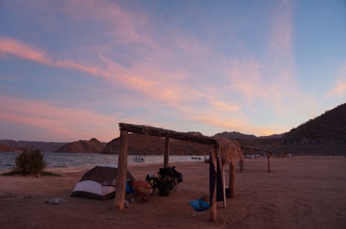 After spending two days in Santa Rosalía, we decided to push on to one of the many beaches south of town. Only a short ride away was Playa San Lucas, a blink-and-you'll-miss-it beach right off the highway. When we rode up, we were a bit discouraged to find that the seaside was already crowded with RVs and trailers, so we reluctantly set up camp twenty feet away from the beach (yes, life is hard). We dropped our bikes, set up the tent, and made a beeline for the water, which was warm and welcoming. That was exactly the point when the trip went from sweaty endeavor to luxurious vacation. But we hadn't been in the water for five minutes before we heard a man on the beach yelling to watch out for stingrays. We didn't want to pull a Steve Irwin, so heading back to shore seemed like a good idea.