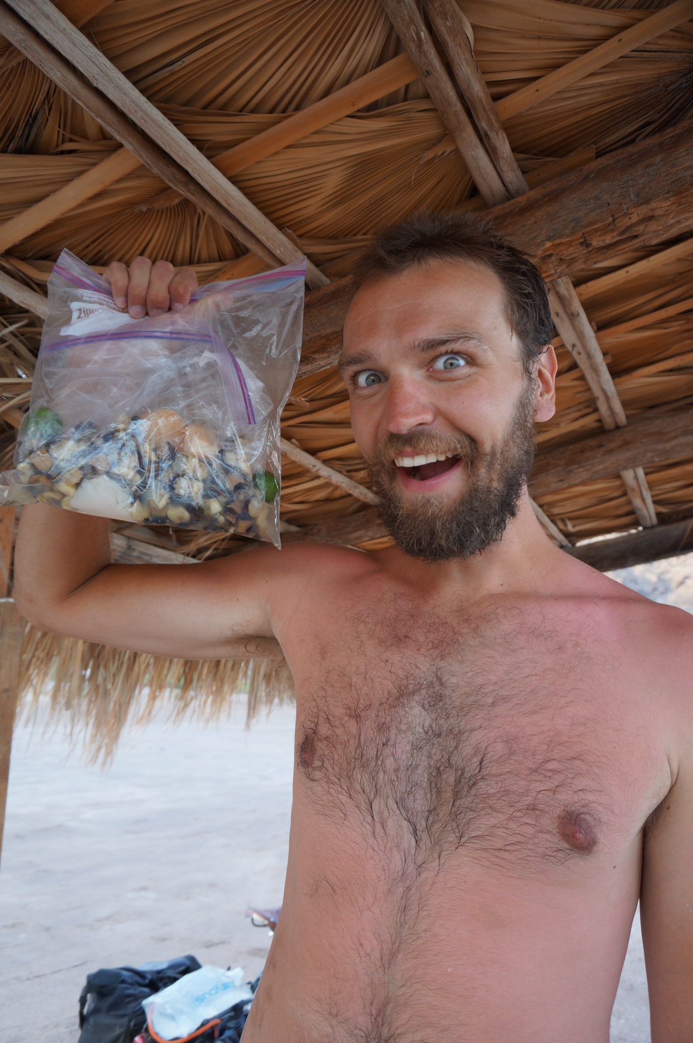 What's more, our faith in humanity was officially restored that night, as random little acts of kindness can sometimes do. We had resolved to move our tent down the beach a ways to avoid any further incidents of car-induced insomnia. We probably made quite a spectacle with our several trips up and down the beach dragging a tent, bikes, et cetera, and shared a few embarrassed smiles and buenas tardeses with the young family in the palapa next to us. Well what do you know, as they started to pack up to leave they sent their two adorable little girls over to our new palapa. The girls, who must have been about five and three, were wearing matching dresses and shy smiles and brandishing a Ziploc bag. They handed the bag to Alex and said that their mom wanted us to have it. The bag was full of fresh seafood and limes – Alex looked over to the parents with a questioning look and they grinned and gave a friendly wave. She walked over to thank them, and then, on top of the seafood, they offered us the rest of their water barrel. Maybe we looked really hungry and smelled really bad, or else these people were just a great example of human kindness. Either way, jackpot! Fresh seafood (for me), fresh water for showers and dishes, and a fresh outlook on Santispac all made for a peaceful night's sleep under the stars (THE STAAARS!!!).
