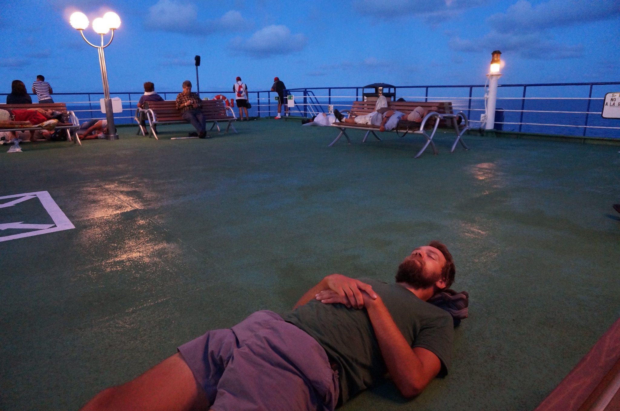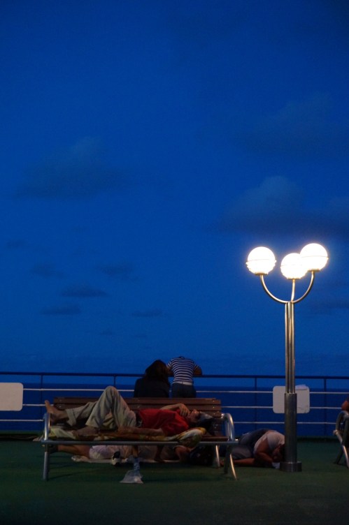 Once night fell, Erick and Lorena went to the cabin that they had wisely reserved ahead of time, while we assessed our options as Real Steel played in the background. We decided that we would rather attempt sleep than watch a robot boxing match (seriously?), so we reverted to the only available option: the deck. And believe me, we were not the only ones. Alex scored a bench, while I simply dropped on the ground. You wouldn’t believe how well shoes can substitute for a pillow when you’re sweaty and dead tired!