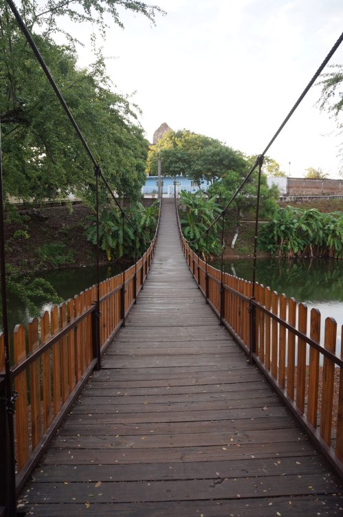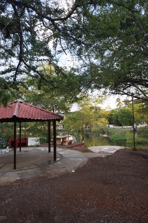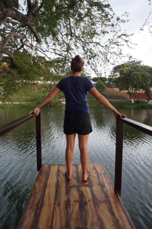Around one in the afternoon we rode into our destination of Rosario. We found our way to a beautiful lake in the middle of town, and spent the rest of the afternoon drinking ice cold juice and napping. Once dinnertime rolled around, we decided to put our tent on a little island in the lake, which was connected to shore by a long wooden rope bridge. It turns out that we should have thought twice about our choice of campsite. As soon as we had pulled up to the island, we were surrounded by a group of local teenagers. They had question after question for these two strange gringos on bikes, covering everything fom our trip to our tastes in music and sports. Since my Spanish is less than passable, Alex had to do most of the talking – which was all well and good for the first hour, but started to drain her a bit as hours two and three rolled around.