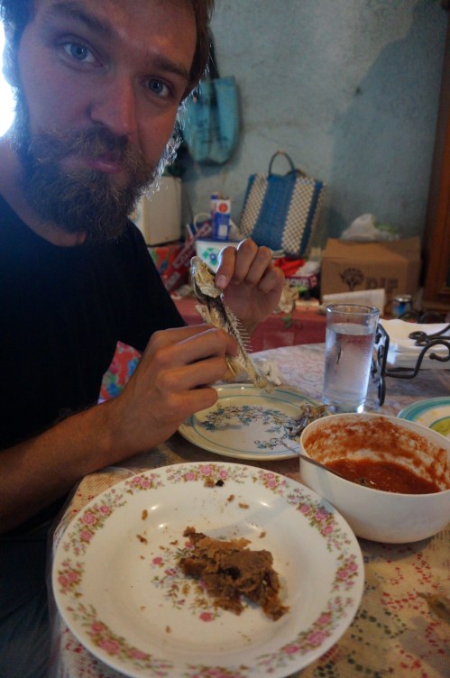 The following morning began with fried fish, a treat that we simply couldn’t say no to. By fried fish, we mean the whole fish, eyeballs and all, caught the previous night while we were sleeping in air conditioned bliss. While Alex nibbled on her portion at first, I went to town on those fish. All the while Francisco’s mother stood by my side and kept complimenting me for being such a good eater. Truer words have never been spoken. After breakfast we licked our fingers, gave hugs, said goodbyes, and exchanged phone numbers. Another brother even escorted us back to the cuota.