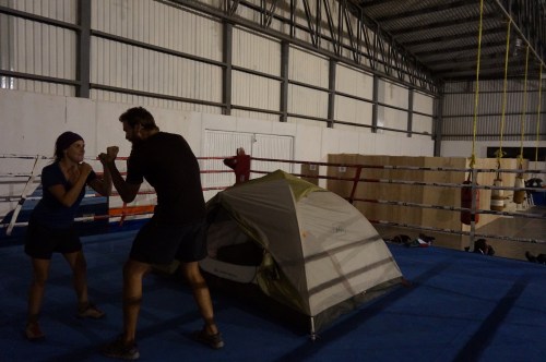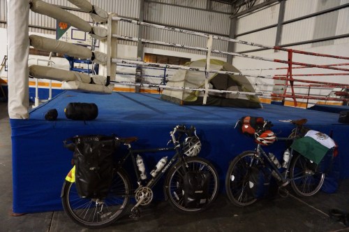 After taking pictures with the awestruck children, and trying to clarify that our panniers were filled with stinky clothes and not Christmas presents, the oldest girl and the boy took us to a closeby taqueria for yummy and dirt-cheap tacos. The boy just grinned at me while I, Santa Tom, devoured my chorizo tacos. Afterwards we bid our goodbyes and went to the local Oficina de Procteccion Civil to sort out a place to sleep for the night. The proteccion civil provides emergency medical services to towns throughout Mexico, and had been recommended to us as a good place to ask for a safe campsite. Well, this proteccion civil happened to be located adjacent to a big gymnasium, and after a quick inquiry we were allowed to camp inside. After sleeping in a city hall auditorium back in Jala we thought we couldn’t find a more obscure spot to camp…but alas, we were mistaken. For the sake of our comfort, we were told to set up our tent in the boxing ring surrounded by punching bags and weightlifting machinery. This one takes the cake!