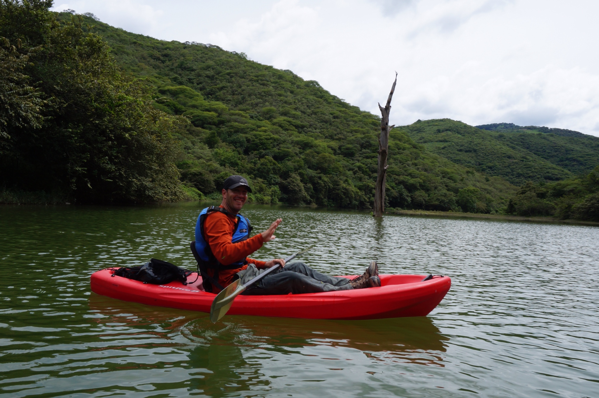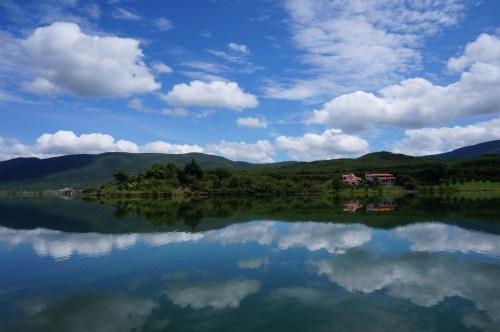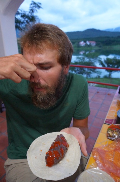 The next morning we were contacted by Rodrigo, a WarmShowers host in Jalpan. We were happy to escape the dubious Hotel Red Inn, hop in the back of Rodrigo’s truck, and make for his home – a small hotel he was constructing nearby. And what a place it was! Located on a hillside overlooking an scenic lake and the lush green mountains in the background, it was easily one of the most beautiful places we’ve stayed at thus far. (Note from Alex: It was made extra-beautiful by the three huge dogs we shared it with – Romeo, Bruno, and Reiko. True love.) But there was no time to take in the surroundings just yet. As soon as we arrived, Rodrigo suggested that we go on a little kayak tour. Five hours later, we returned not just from a kayak trip, but also from a paddle to the edge of a local dam, a hike in the hills up to a mysterious cave, and a visit to a local community to taste freshly made pulque. You can imagine how floored we were by Rodriogo’s hospitality. After all that, he treated us to a rich barbeque, over which we shared stories from the road and learned about the local area – la Huasteca! Looks like we had finally arrived in paradise.
