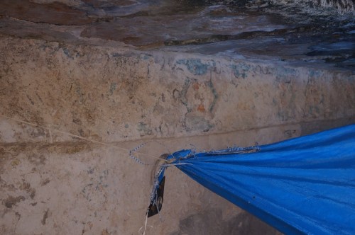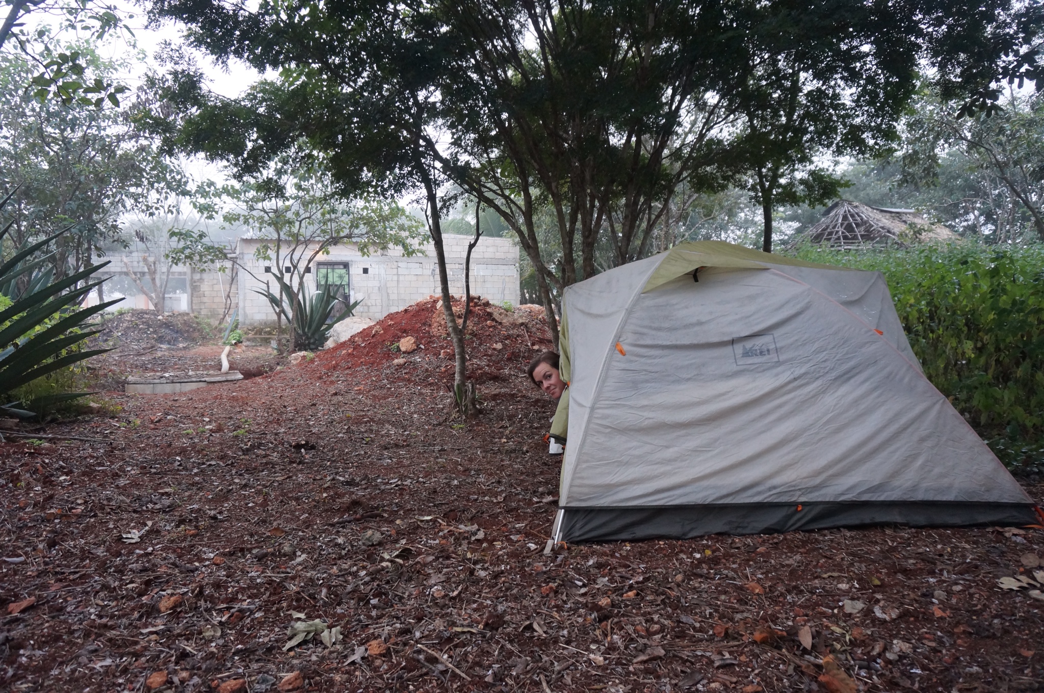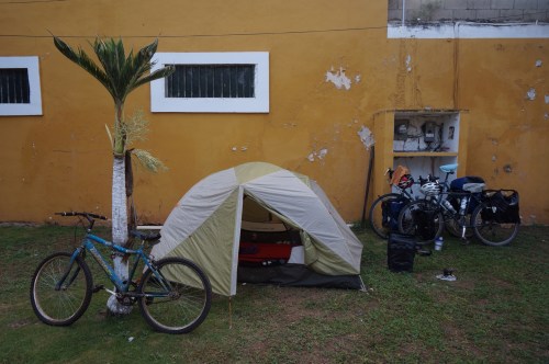 The night before we got to the regional hub of Merida we had our scariest and ultimately most embarrassing experience yet. We had ridden more than fifty miles that day and were plenty exhausted by the time we hit the city of Calkiní. After two unsuccessful attempts to camp at the local balneario and college, we spotted an abandoned building with a nice big backyard safely tucked away from the street’s view. Happy to have found the place, we set up camp quickly and tucked into the tent to hit the hay as darkness descended around us. We were almost asleep when the unthinkable happened. All of a sudden, lights flicked on inside the house! Both Alex and I froze. Upon initial inspection the building had looked completely deserted: no furniture inside, overgrown yard, no people around, no fence, no dog, et cetera. We’ve slept in our fair share of abandoned buildings in Mexico, and thought we knew how to spot a good one. But no, apparently someone was still living in there, and we had put our tent smack-dab in his backyard.