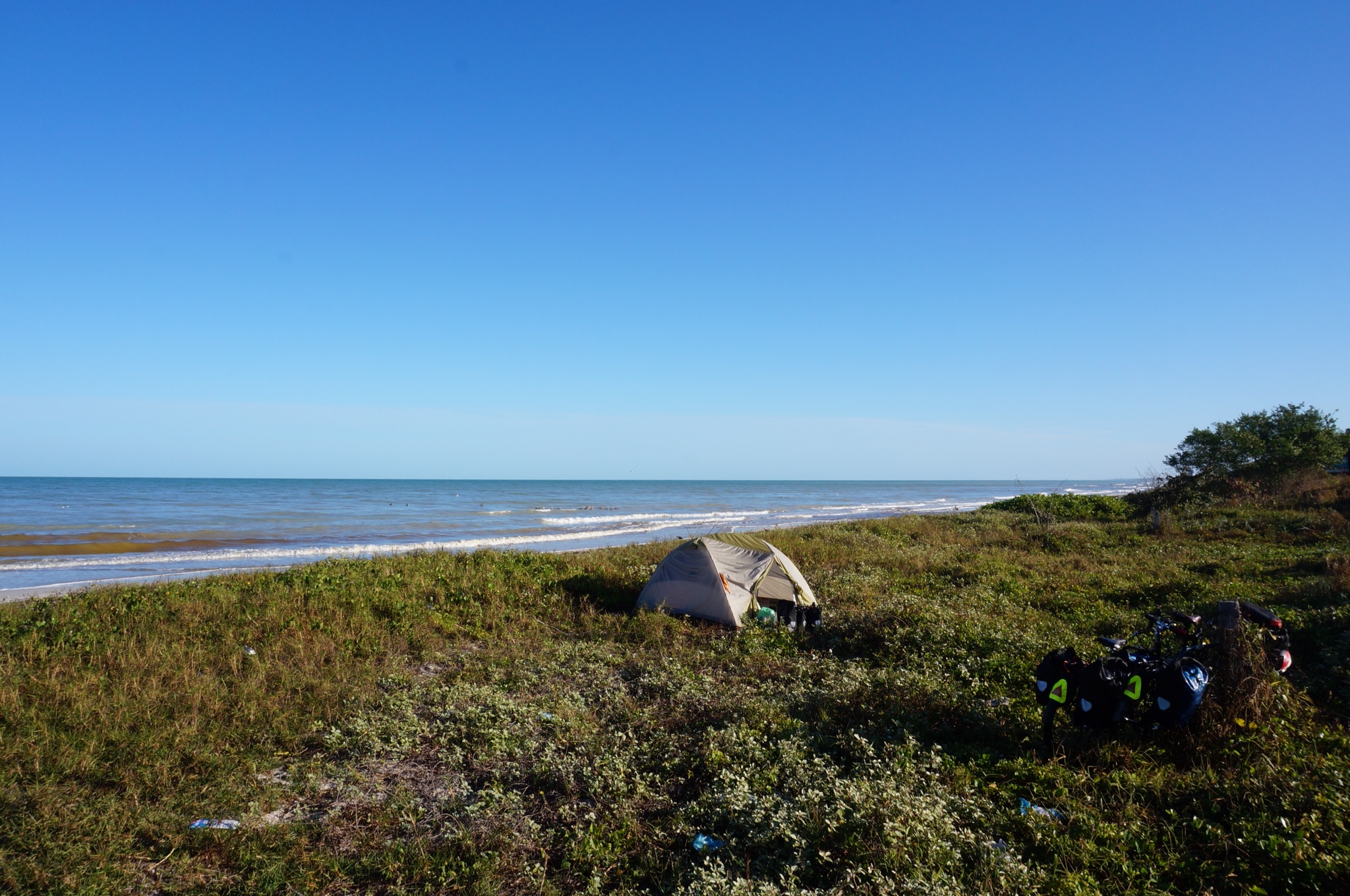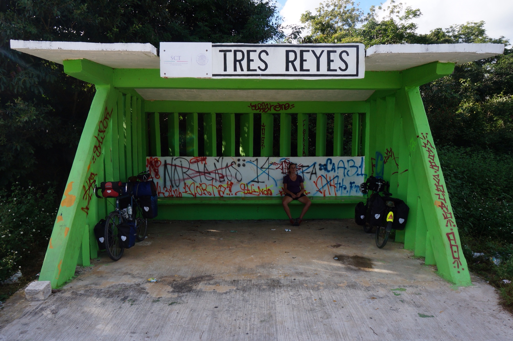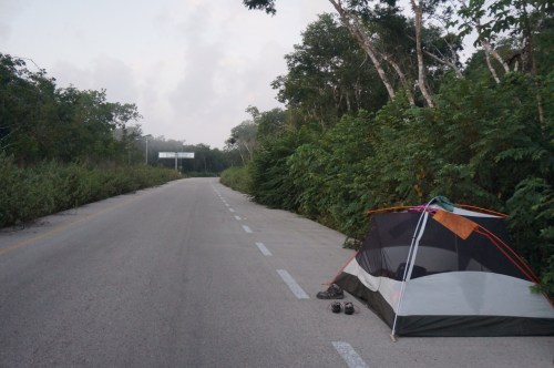 The riding after Tulum was just more of the same: flat, straight and boring. The wind was blowing straight in our faces, and we wondered what we had done to offend Mexico such that she would save the worst riding for last? Why, Mexico, why? Our days were long streams of podcasts punctuated by the occasional shade break in a urine-smelling bus stop. The only interesting thing that happened was that we one night, for a change, didn’t sleep on the side of the road but literally on the road. It was a blocked off stretch of perfectly good highway, and we felt kind of sketchy about it but there was literally nowhere else to stay.