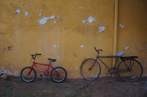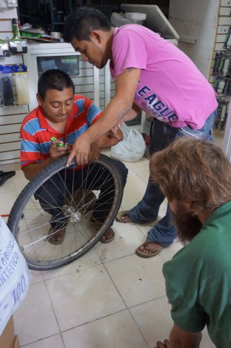 Soon after, I got to experience the first serious problem with my bike: two broken spokes, both on the drive side of my rear wheel. Changing spokes is not a problem (we carry spares with us and have a spoke key handy); however, on the drive side you need to take off the cassette to access the spokes – which requires a chain whip and a big ol’ wrench and a few other things that seemed too big to stuff in our panniers. Even worse, sunset was fast approaching and we were on a near-empty road heading for a rural town in the middle of frickin’ nowhere. Our temporary solution was to strap our big tent bag onto Alex’s rear rack and have me ride standing up to reduce the weight on my back wheel until we could fix the problem. When we finally reached the tiny town of Sotuta fifteen kilometers later, the police let us camp at the presidencia and leave our things there the next morning while we tramped all over town in search of the tool we needed. We talked to about a dozen makeshift mechanics – our favorite of which had his three year old kid practicing wheel building on his front porch. None of them had the tools we needed.