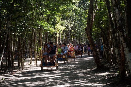After Valladolid we made a stop at the ruins of Cobá, a sprawling site with the occasional pyramid here and there. We had hoped to bring our bikes inside to speed things up a bit, but were told that we would have to pay a fee equivalent to renting a bike from the tour operators. No thanks! So we walked a lot. To our surprise, what made our visit so special wasn’t the ruins themselves but the flurry of Russian visitors that jam-packed the area. What made them so special was their absolute confidence in being dressed appropriately. That meant tight, bright yellow shorts and reflective aviators for the men; skimpy stripper skirts, stripper heels, and really big hair for the women. All this while scooting up and down a huge pyramid on their butts, some of them crying a little bit. Absolutely fabulous.