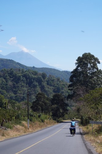 Completely exhausted, we dragged ourselves back to the dock and hopped another lancha back to Pana. We spent yet another much-needed rest day pretty much just looking at the view. (Note from Alex: See below for resultant volcano porn.) During this time we had our second encounter with the mysterious Scarfman, whom we had first spotted in Cobán. He was still dressed all in black, with a red checkered scarf elaborately twisted around his neck. This time around he was staying at the same hotel we were, and when I overheard a conversation he was having with his wife I realized that they were German. While I was fixing up the bikes he came over and started a little chat with me. Like many other people we’ve met, he voiced his concern about the big, fat ding I have in my bike frame and we talked a little more about our travels. Even though I didn’t know it yet, this wouldn’t be the last we would see of Scarfman and his wife, so stay tuned for part three.